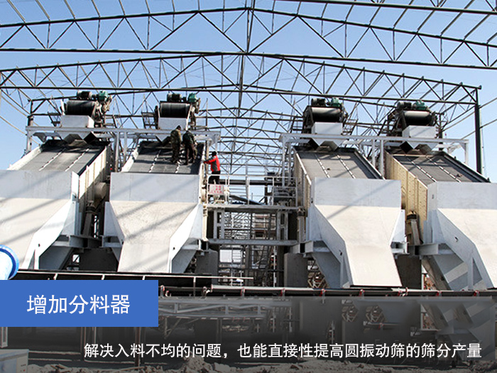 針對漏斗分料不均,對漏斗進行改造,在皮帶下料處增加一個分料器,分料器可以根據皮帶跑偏的情況左右移動,把礦石均勻分入兩邊漏斗,進入圓振動篩,使2邊入料相對均衡,很好地解決入料不均的問題,也能直接性提高圓振動篩的篩分產量。