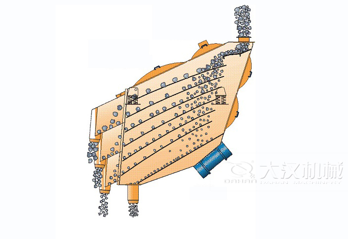 概率篩啟動后,呈對稱布置的兩臺相同型號和規格的振動電機或激振器作同步反向運轉,其產生的激振力通過傳振體—電機或激振器底座傳遞到整個振動體—篩箱上,使篩箱帶動篩面作周期性振動,從而使篩面上的物料隨篩箱一同作定向跳躍式運動,其間,小于篩面孔徑的物料通過篩孔落到下層,成為篩下物,大于篩面孔徑的物料經連續跳躍運動后從排料口排出,完成篩分作業。