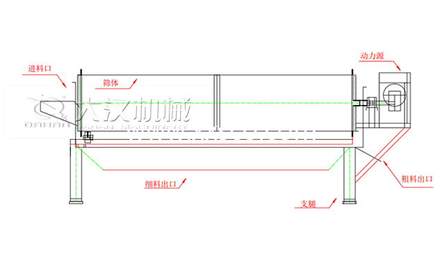 滾筒裝置:進行物料篩分的的場所,物料利用輸送帶進入到滾筒中之后,在滾筒中翻滾離散來達到篩分的目的。